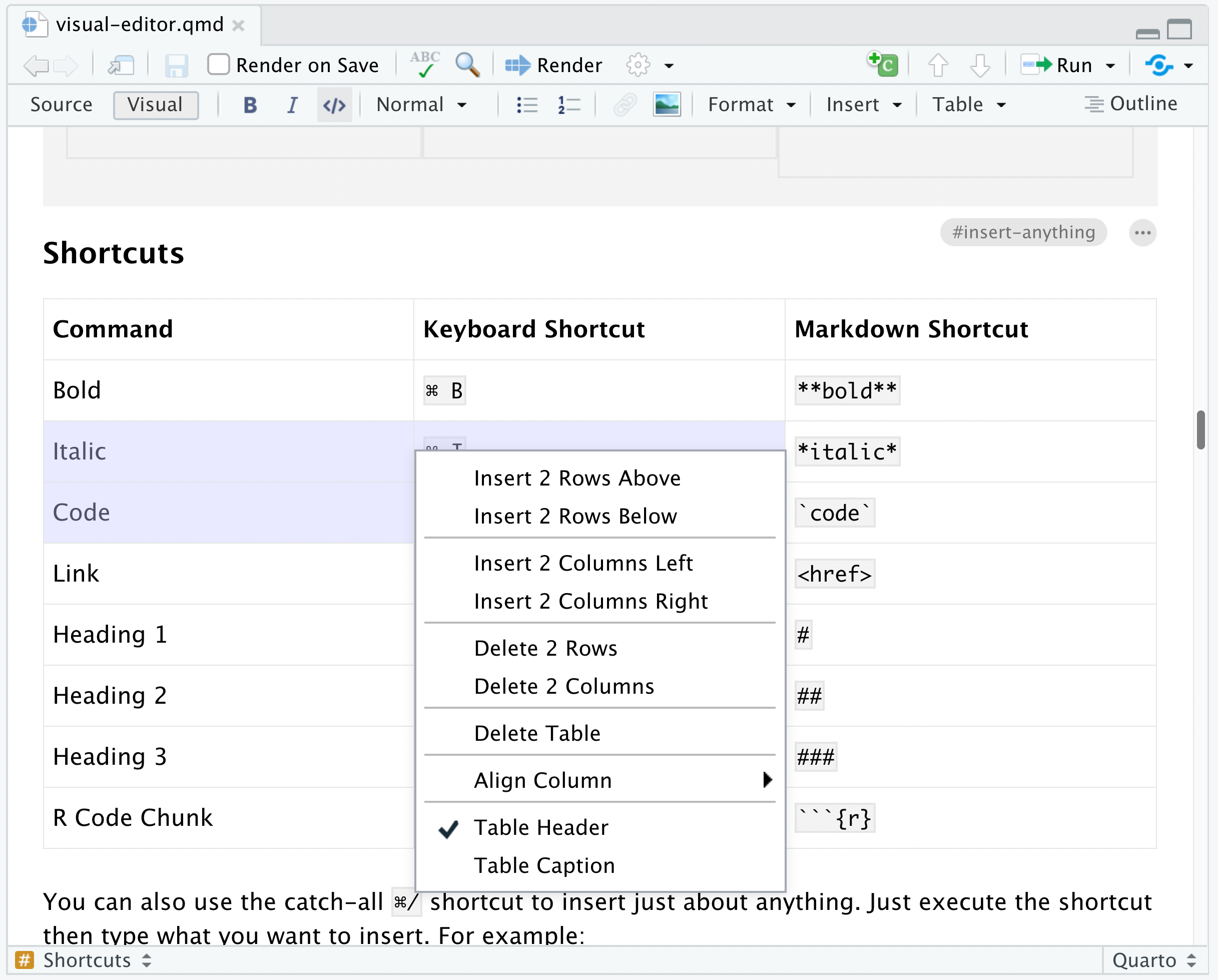 Visual mode supports editing all of Pandoc markdown. Standard formatting commands (headings, bold, italic, etc.) work just the way they do in a conventional word processor.